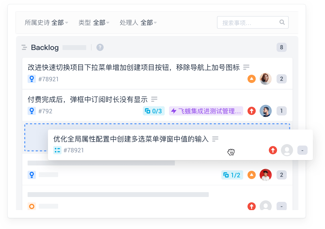 在 「Backlog」管理产品想法与用户需求,按照史诗、需求、任务等不同颗粒度拆分产品需求,快速拖拽规划迭代任务。