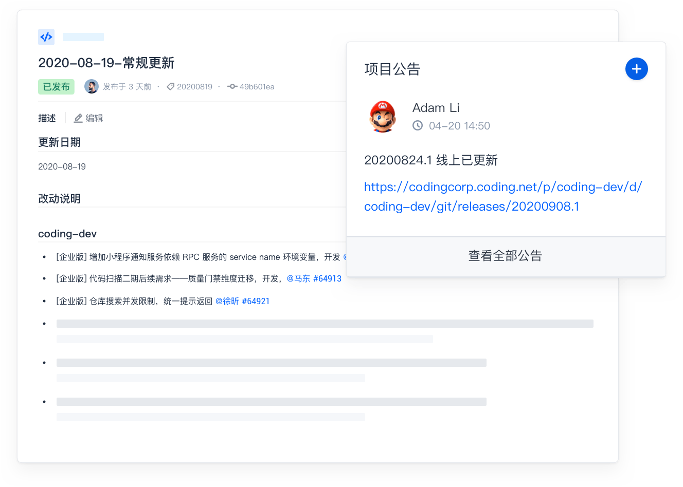 开发任务直接关联到代码仓库提交记录,自动生成的发版记录均可关联到具体任务,每一次代码提交有迹可循,在一个平台即可完成所有开发工作。