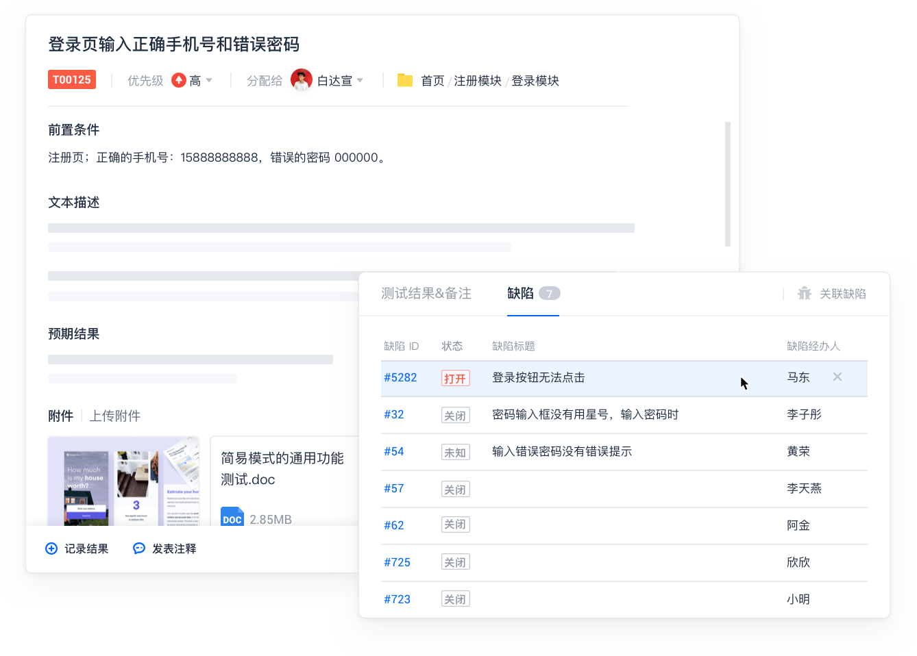 测试用例一键发布到缺陷,紧密关联,方便快速定位上下文场景,快速完成缺陷重现。