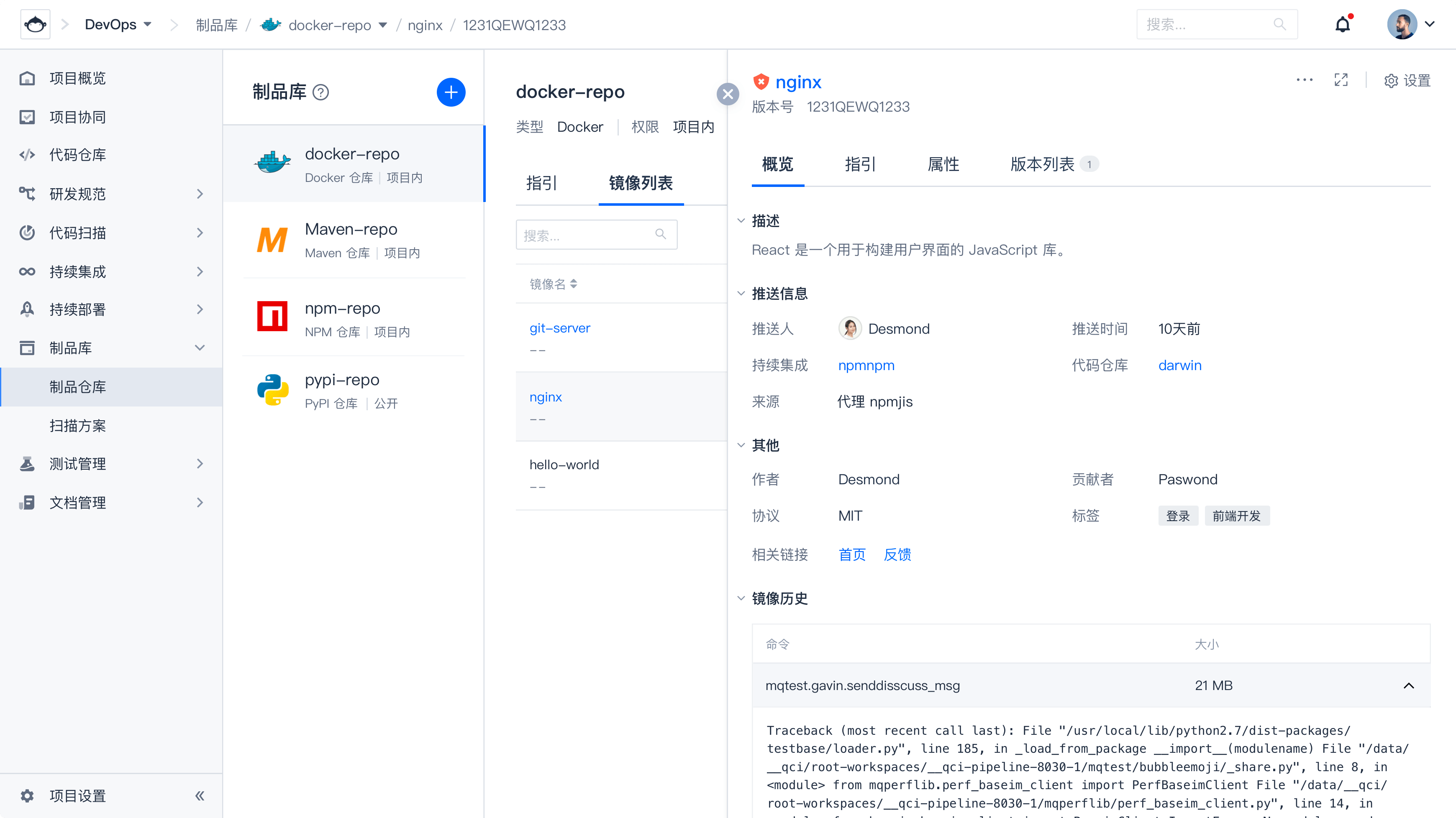 支持 Docker、Maven、Helm、NPM 包等常见制品库类型。