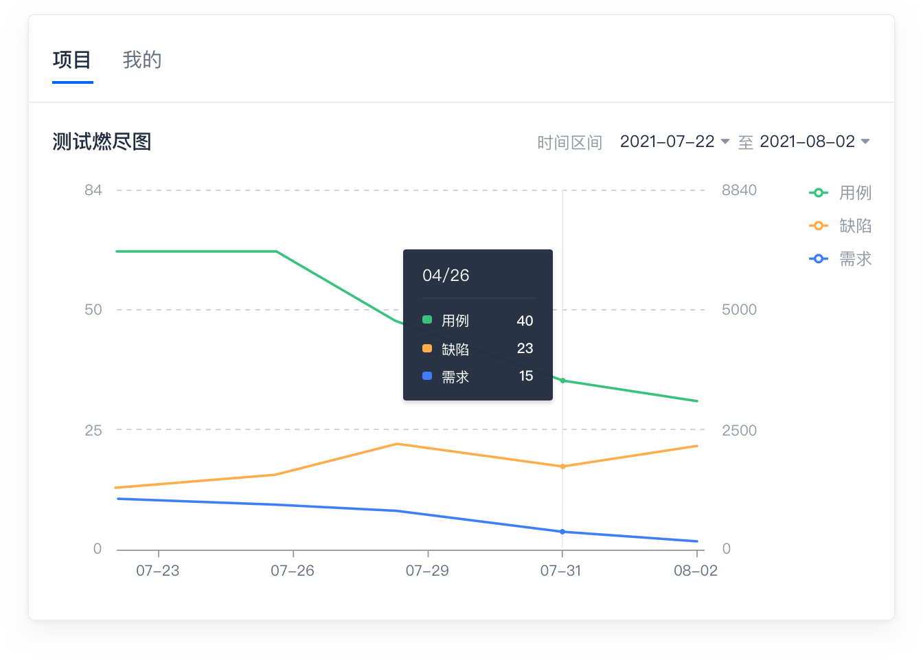 提供待测试需求、待回归缺陷、待执行用例的燃尽曲线,助力管理者分析并优化整体测试工作的效率。